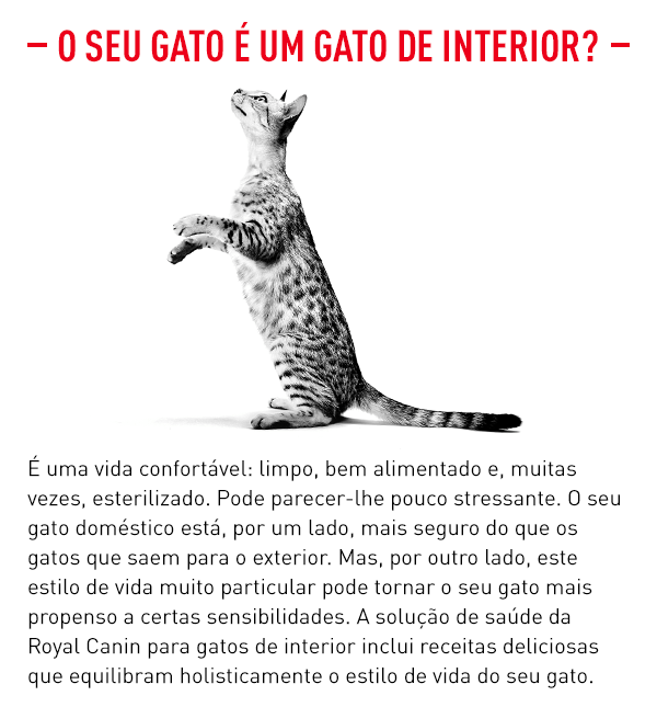 Alimento completo e equilibrado para a alimentação diária de gatos adultos saudáveis com mais de 7 anos que vivem dentro de casa sem acesso ao exterior.