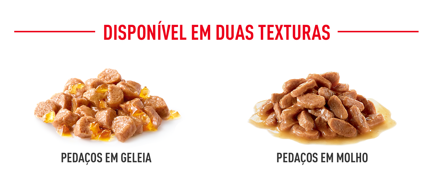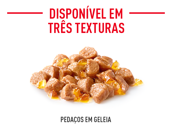 Fácil mastigação - pequenos pedaços em geleia, pequenos pedaços em molho ou textura de patê macio.