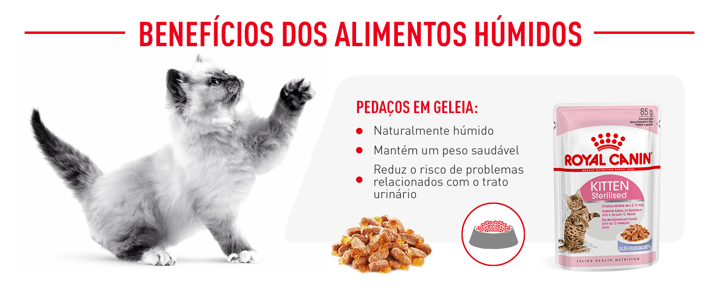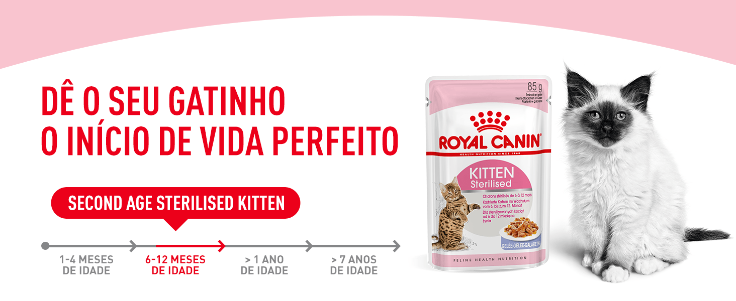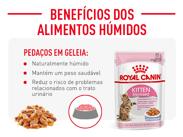 Cuide da saúde do seu gatinho e controle o seu peso após a esterilização com Royal Canin Kitten Sterilised: irresistíveis fatias de carne em uma suculenta gelatina.
