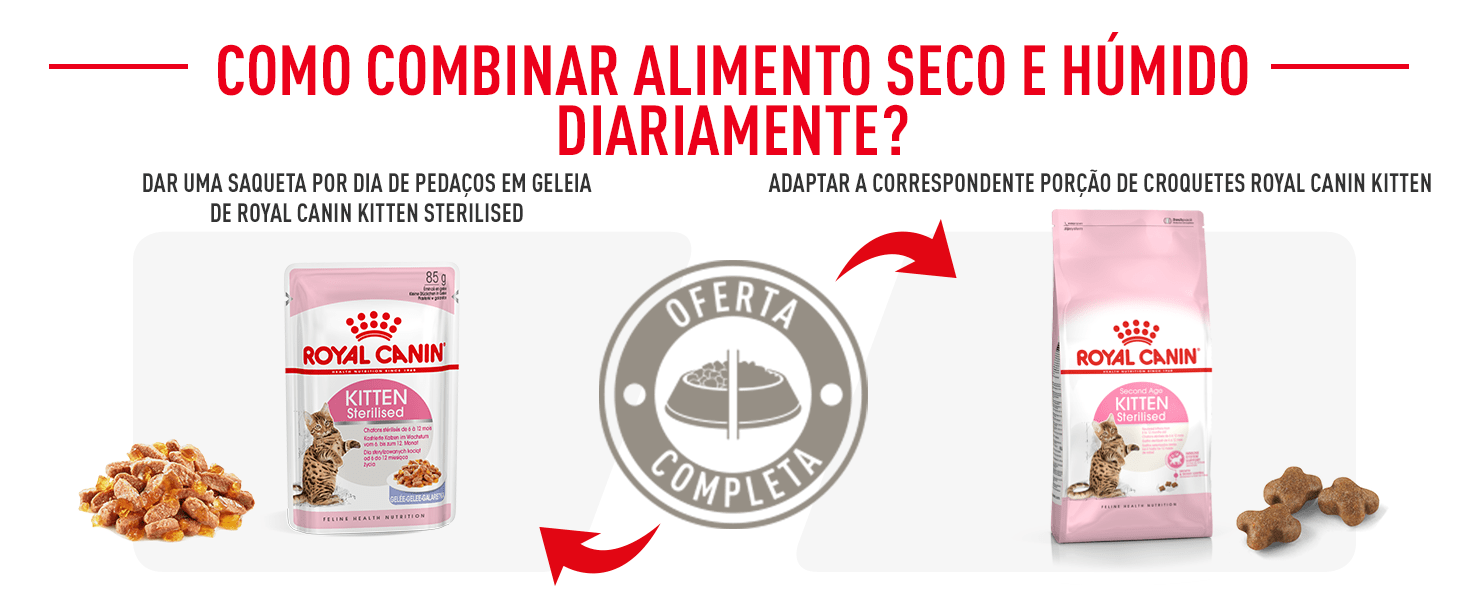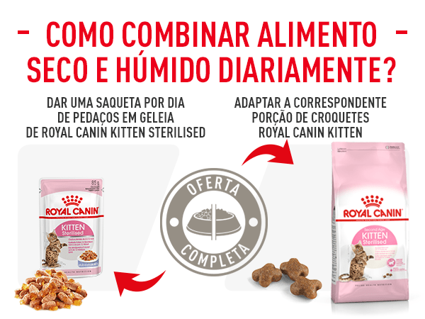 Royal Canin Sterilised Kitten está disponível em 3 formatos diferentes: ração e pedacinhos de carne em gelatina ou em molho. Combine estas alternativas para oferecer uma dieta variada e muito completa.