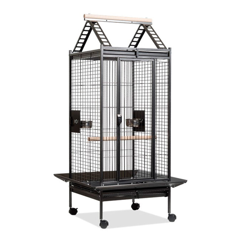 A parte inferior da gaiola tem placas metálicas inclinadas que recolhem a sujidade e impedem que esta se espalhe à volta da gaiola. Está equipado com rodas para fácil movimentação. É muito fácil de limpar e desinfetar. Inclui 4 comedouros pequenos e 5 médios de aço inoxidável e 2 paus de madeira. Um grande habitat para o seu amigo emplumado!